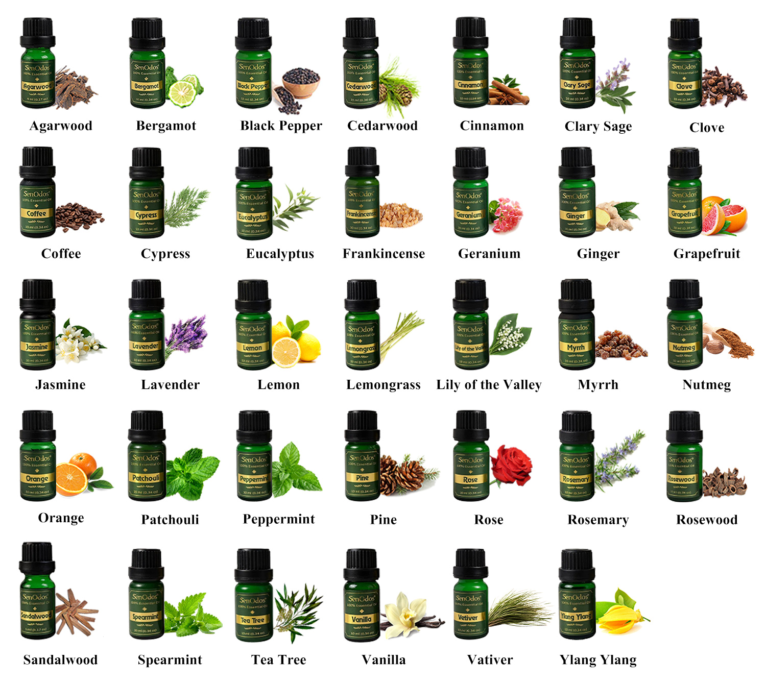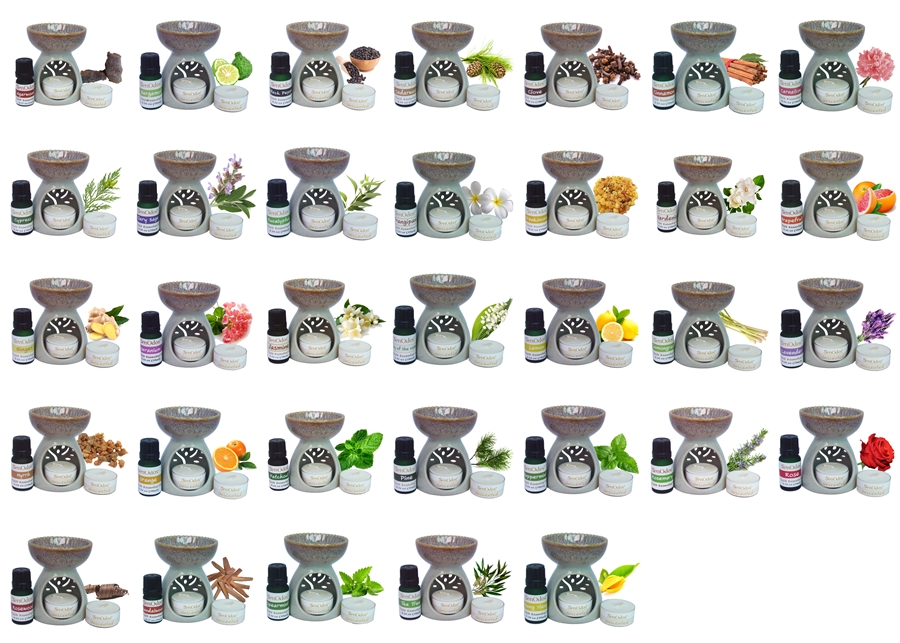 น้ำมันหอมระเหยแท้ 100% (Pure Essential Oils) มีให้เลือก 35 กลิ่น ได้แก่ กุหลาบ ไม้หอมกฤษณา, มะกรูด, แครี่เซจ, ยูคาลิปตัส, เจอร์เรเนียม, เกรปฟรุต, มะลิ, ลาเวนเดอร์, เลมอน, ตะไคร้, ส้ม, แพทชูลี่, เปปเปอร์มินต์, โรสแมรี่, ไม้หอมแก่นจันทร์, สเปียร์มินต์, ทีทรีออยล์, กระดังงา,พริกไทยดำ, คาร์เนชั่น, ไม้ซีดาร์วูด, อบเชย, กานพลู, ขิง, ไซเพรส, ลีลาวดี, กำยาน,พุดซ้อน, ลิลลี่, ไม้สน, ไม้โรสวูด, มดยอบ, กาแฟ, วานิลลา